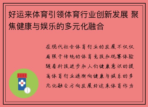好运来体育引领体育行业创新发展 聚焦健康与娱乐的多元化融合