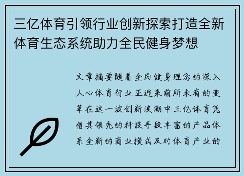 三亿体育引领行业创新探索打造全新体育生态系统助力全民健身梦想